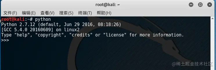 2.1.1 ZEND OF PYTHON 在Kali中启动终端,输入Python,进入交互模式。