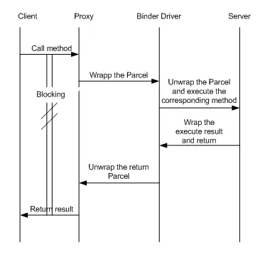通过上图我们可以看出:(1)数据的发送和接收是通过Binder驱动程序调度完成的。(2)Binder驱动处理完发送方请求操作之后,会把数据写入到缓存区。该缓存区域对于接收方来说是“读缓冲区”(binder_write_read.write_buffer)(3)接收方会读取缓存区中的数据,在未读取到数据之前,接收方一直处于阻塞状态。