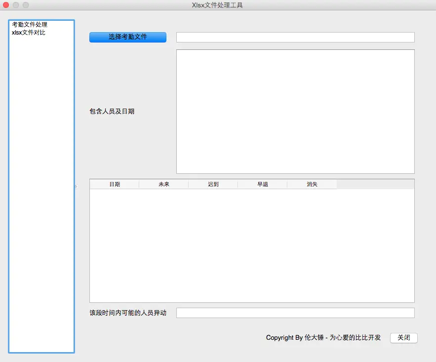 为了减轻妹子工作中处理Excel的辛苦,用python写了几个处理xlsx的代码,分别完成一些独立的任务,如根据考勤记录判断每天未来、迟到、早退的名单,实现两个复杂xlsx文件的单元格对比,等等。但妹子毕竟是文科生,直接提供py代码并且要求在命令行中调用,还是极度的不友好。所以这次希望能够完善一下,主要实现三个目标:功能整合、提供GUI、打包成exe。