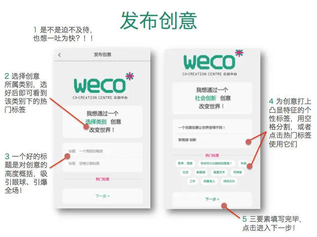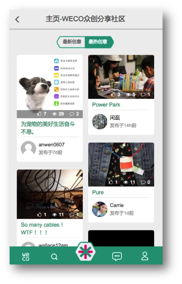 WECO是一个开源的共创社区,是一片创意互相碰撞的土壤。在这里你可以查看、喜欢、评论他人发布的创意,可以关注和私信感兴趣的用户,当然还可以发布属于自己的创意!