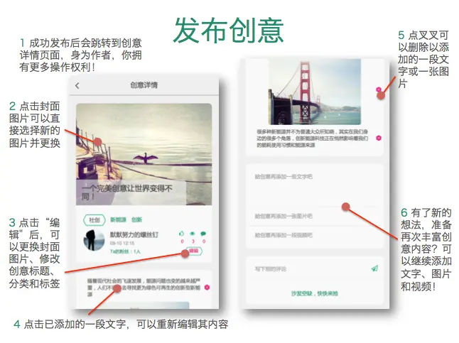 - 填写完创意标题、分类和标签,选择创意封面图片、编辑好创意内容之后即可发布创意。创意的内容由一段段文字、一张张图片和一个个视频等原子元素组成,发布之后还可以继续以时间轴的顺序编辑、添加和删除创意内容的各个原子元素;
