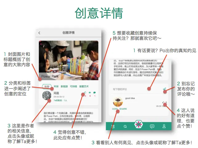 - 创意详情页包括封面图片、标题、分类、标签、作者信息、点赞数、阅读量、评论数和创意内容,喜欢创意、评论创意和评论点赞功能也已经实现;