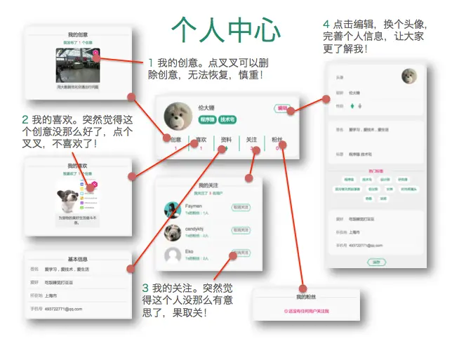 - 个人中心,在这里可以编辑我的个人资料,包括修改头像、昵称、性别、个性标签等信息,并可以删除自己的创意、取消喜欢已经喜欢的创意、取消关注已经关注的用户、查看有哪些粉丝关注了自己;