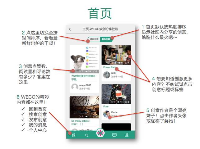 - 以“最新”、“最热”两种排序方式在首页瀑布流展示最新创意;