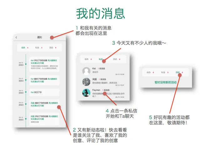 - 我的消息,在这里可以看到和自己相关的动态,如他人关注了自己、喜欢了自己的创意等,还可以看到别人发送的私信消息并打开私信窗。