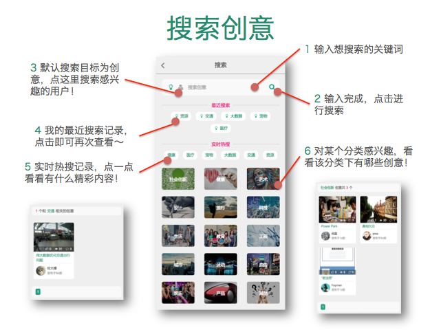 - 搜索创意,搜索目标可以是创意或其他用户,支持关键词匹配搜索和创意分类搜索,并且实时显示“我”的最近搜索记录和当前系统实时热搜;