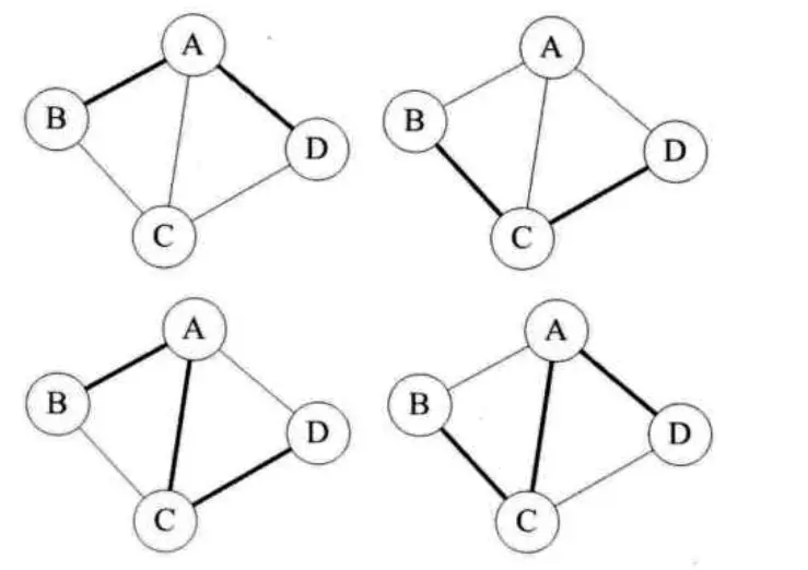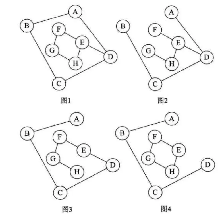 如下图所示,图1是一个普通图,但是显然它不是生成树,当去掉两条构成环的边后,如图2或图3,就满足生成树的条件了,即n个顶点和n-1条边且连通的定义,它们都是一棵生成树。由此可以得知,如果一个图有n个顶点和小于n-1条边,则是非连通图;如果它多于n-1条边,则必定构成一个环。但有n-1条边也不一定是生成树,如图4。