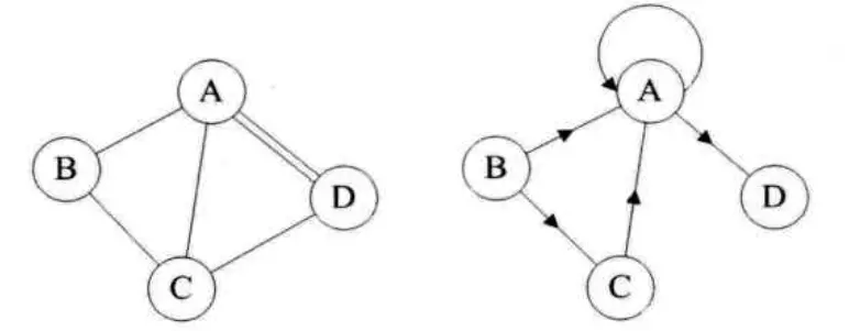 如下图左边的图就是一个无向图$G_1$,$G_1 = (V_1,{E_1})$,其中顶点集合 $V_1 = {A,B,C,D}$,边集合是$E_1 = {(A, B), (B, C), (C, D), (D, A), (A, C)}$。