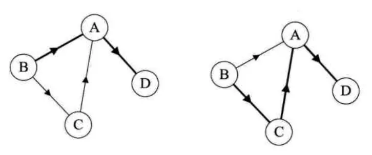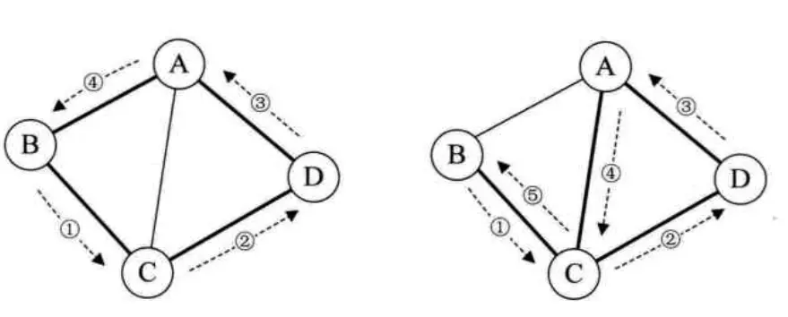 下图中,两个图都是一个环,但左侧的图是一个简单环,而右侧图中顶点C重复出现,因此它不是一个简单环。