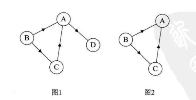 如下图所示,图1并不是强连通图,因为顶点A到顶点D存在路径,但不存在从顶点D到顶点A的路径。图2就是强连通图,而且显然图2是图1的极大强连通子图,即是它的强连通分量。
