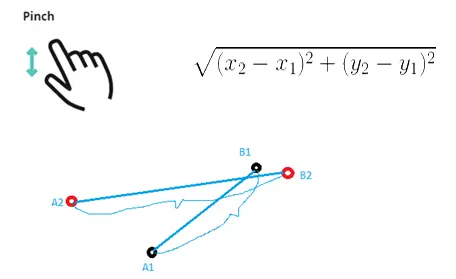 如上图所示,两点之间的距离比值求pinch的scale。这个scale会挂载在event上,让用户反馈给dom的transform或者其他元素的scale属性。