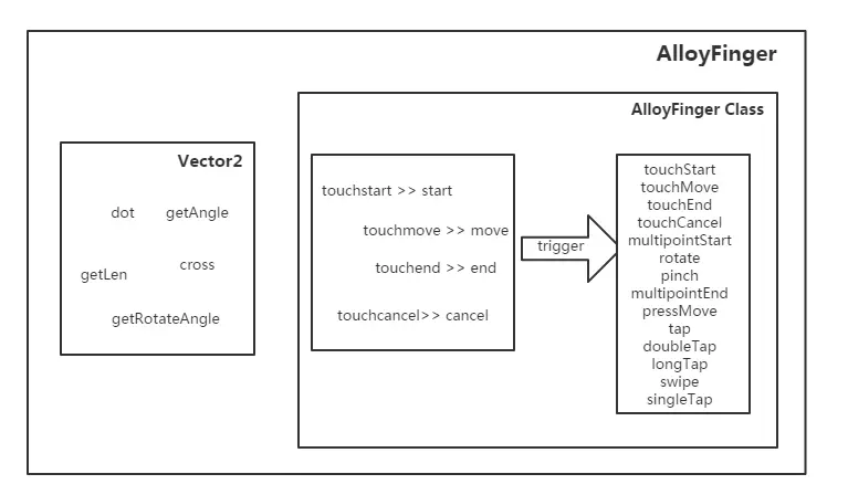 主要的一些事件触发原理已经在上面讲解,还有如multipointStart、doubleTap、singleTap、multipointEnd可以看源码,不到200行的代码应该很容易消化。trigger手势事件的同时,touchStart、touchMove、touchEnd和touchCancel同样也可以监听。 详细的Vector2和AlloyFinger代码可以去Github上查阅: