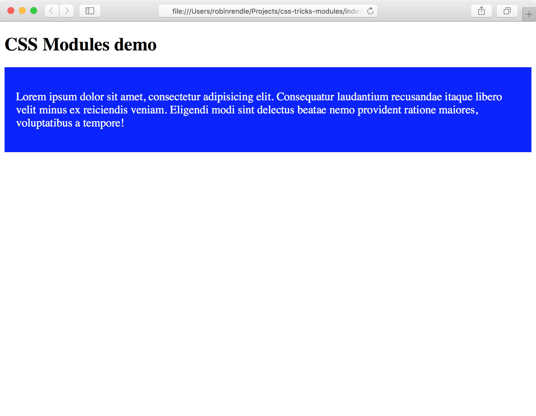 通过渲染编译JS模板和CSS文件来实现CSS模块化的方式不止一种。在今天的教程中,我们只着重讨论一种在项目中应用CSS Modules的实现方式: