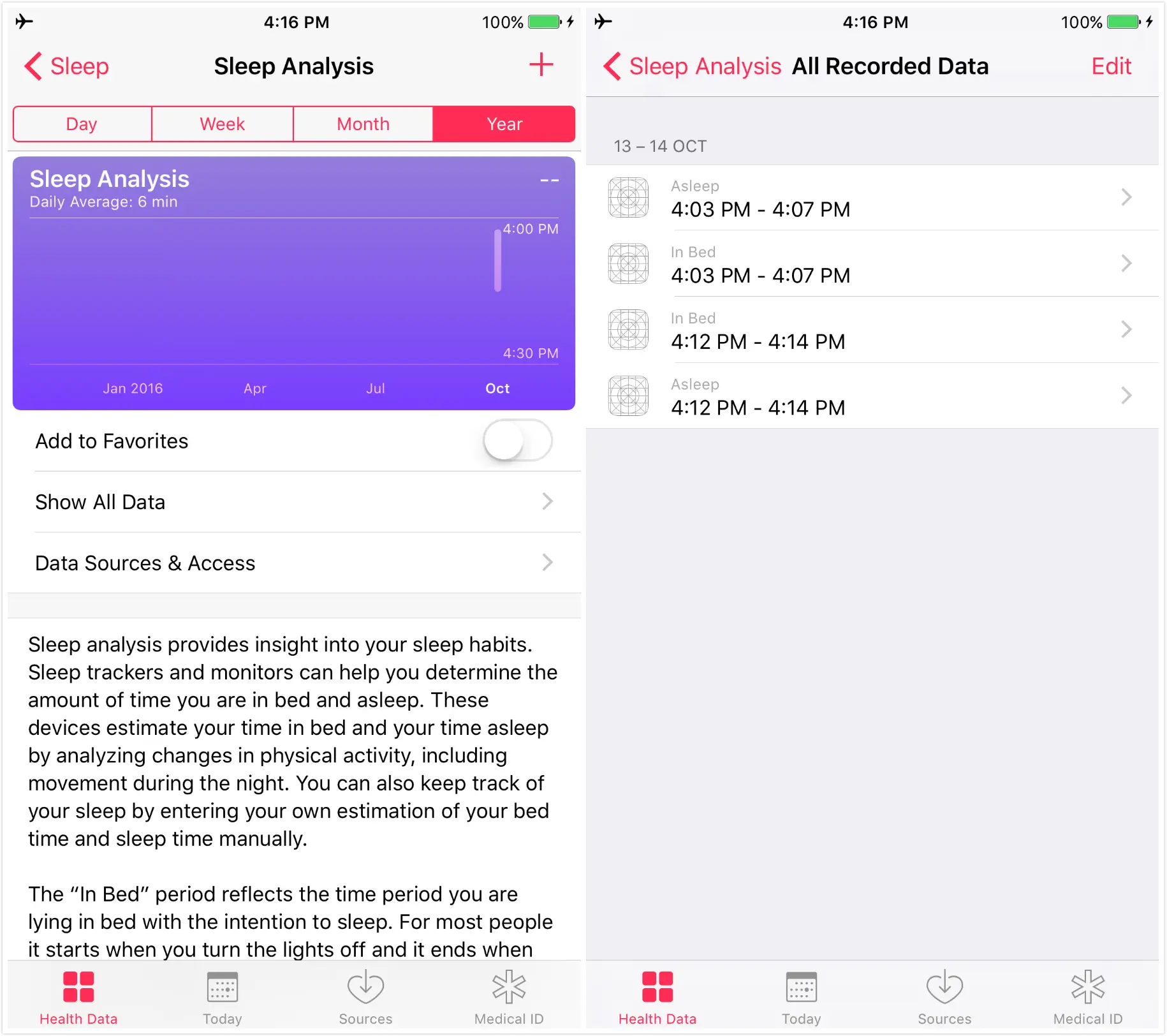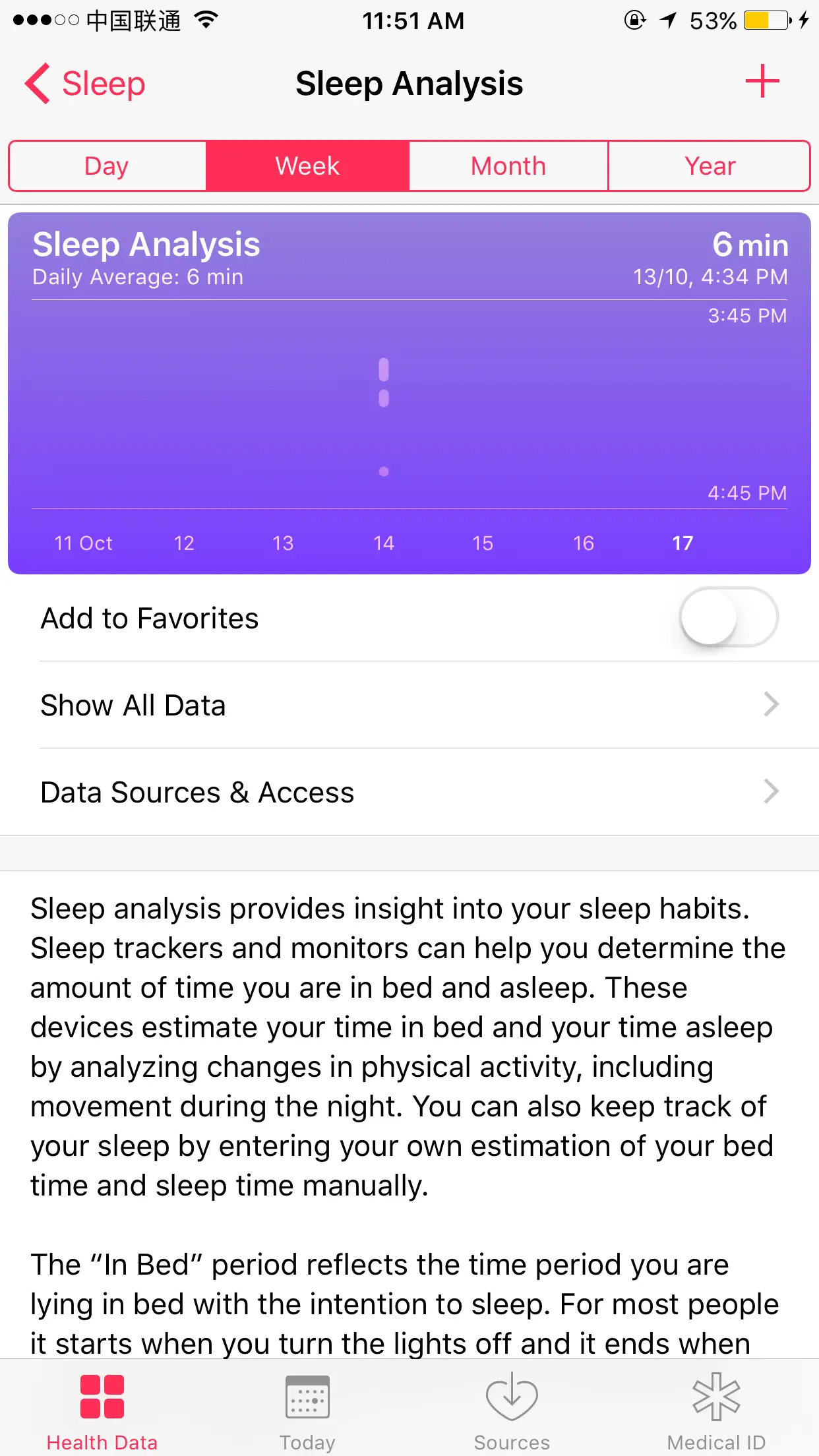 在Health应用程序中,并没有自动去统计用户的睡眠起始时间等数据,但是Health为我们提供了一套数据写入和分析功能,开发者可以依照特定的数据格式将睡眠数据写入到Health,通过Health分析后,得到数据的分析结果。