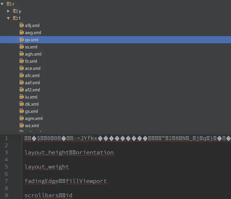 这个文件是编译后的二进制资源文件,里面是id-name-value的一个map。因为微信做了资源的混淆,所以这里可以看到资源名称都是不可读的。