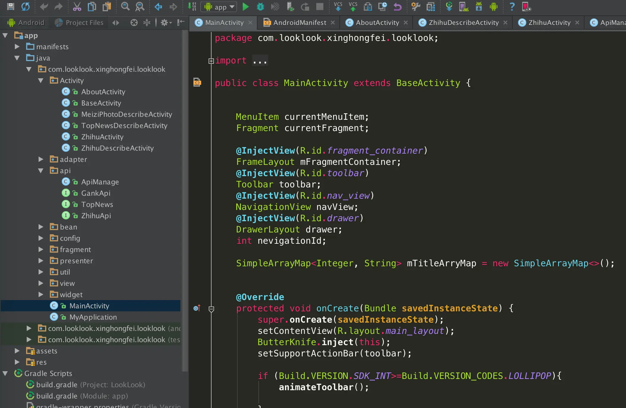 第一步下载项目,在真机或虚拟机上运行,最直观的体验app的功能。然后熟悉app的架构,mvc、mvp、mvvm,目前项目中mvvp用的比较少。然后打开build.gradle文件看看项目用了哪些网络请求库、图片加载库、其他库。如果有不熟悉的,上网找一些文章学习一下。然后就打开manifasts文件找的入口activity,顺藤摸瓜往下看。同样,不懂的地方放过。看完一遍,再进行下一步,不要指望一遍就可以搞定。这里给大家推荐我的开源项目LookLook(Github地址:https://github.com/xinghongfei/LookLook):mvp架构,RxJava + Retrofit+okhttp,glide。项目结构清晰,代码量不是很大,学习价值高。