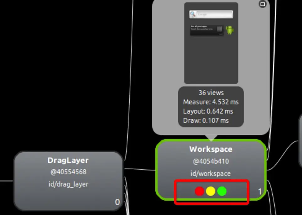 上图红框标出的三个点是关键分析数据. 左起依次代表View的Measure, Layout和Draw的性能. 另外颜色表示该View的该项时间指数, 分为:- 绿色, 表示该View的此项性能比该View Tree中超过50%的View都要快.