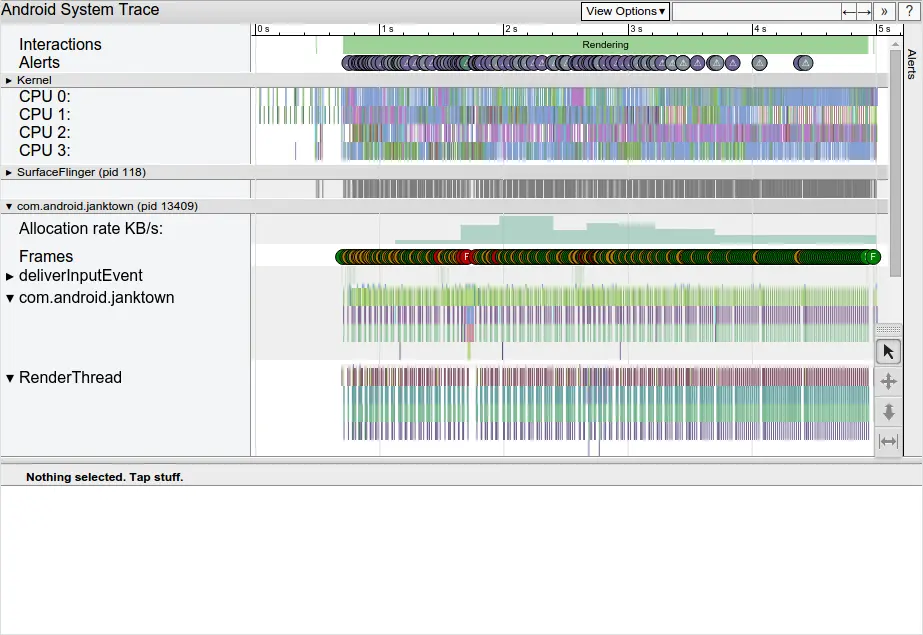 Systrace是一个收集和检测时间信息的工具, 它能显示CPU和时间被消耗在哪儿了, 每个进程和线程都在其CPU时间片内做了什么事儿. 而且会指示哪个地方出了问题, 以及给出Fix建议.