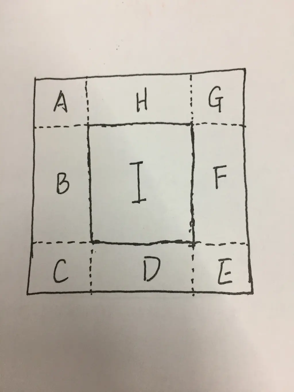 这里我画了一张图,整个一个方框表示的是一个图层,如果我们将图层的contentsCenter设置为{0.25,0.25,0.25,0.25}那么,其实这个rect形成的一个方框就是中间的I区域,相当于整个图层的正中心,宽高各一半的位置 如果我们现在改变了图层的大小的话,我们定义了这样一个拉伸区域{0.25,0.25,0.25,0.25},表示的就是在横向拉伸中H区域和D区域会被拉伸,在纵向拉伸中,B区域和F区域会被拉伸,而中间的I区域则是横向纵向均会被拉伸,而其中的A、C、E、G则不会被拉伸,可能这里需要着重理解一下