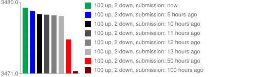 下图表现的是具有相同支持和反对的票数,但时间不同的文章的排名得分情况: