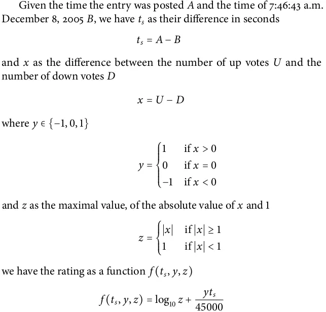 T表示距离发帖的时间(单位为小时),加上2是为了防止最新的帖子导致分母过小(之所以选择2,可能是因为从原始文章出现在其他网站,到转贴至Hacker News,平均需要两个小时)。
