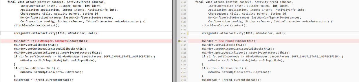 L版本是通过一个策略类PolicyManager,使用反射机制获取IPolicy来实例化mWindow,而M版本直接在attach方法中,mWindow = new PhoneWindow(this);直接实例化。不知道这其中是不是考虑到了性能的优化。