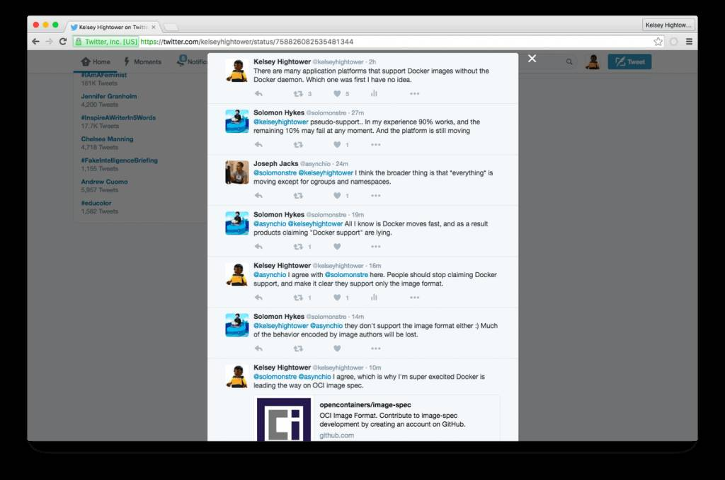 Hykes 反驳道OCI的容器格式是个“伪标准”,最多也只能算作一个中间格式。对于Hightower而言,这些话是最令他惊讶不已的坦言。Hykes认为:Docker已经完成了支持OCI的工作,并已经发布,而Docker版本的迭代速度如此之快,以至于标准化的革新将减缓。
