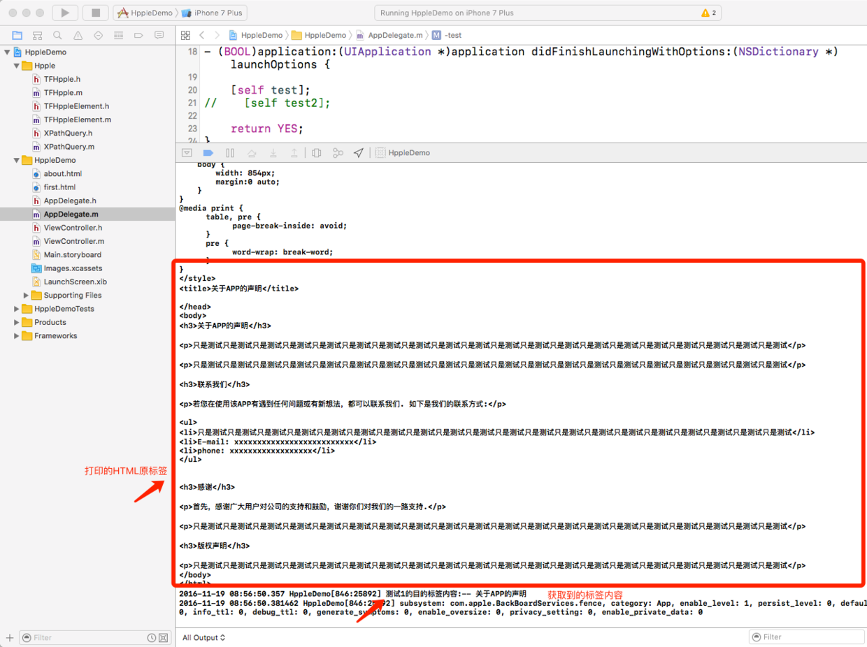 那么iOS端怎么处理呢,不使用三方库直接简单粗暴的方法就是分割字符串,然后去除HTML标签,然后处理,听听就让人惆怅,然而毕竟是一种方法,能解决问题的方法都是好方法,我们就放一下主要的代码,去除HTML标签的方法如下: