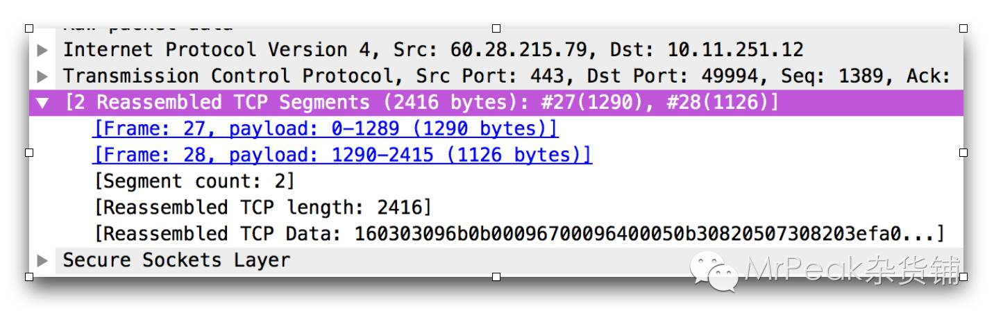 从包列表界面可以看出,Certificate(大小为2407个bytes)这个包由于超过了1440个字节,被拆成了2个包,所以我们可以在包Info里面看到[TCP segment of a reassembled PDU],我们使用Wireshark抓包的时候经常会看到reassembled PDU,出现这种情况是因为包太大,超过了MSS,需要拆成两个来发送。