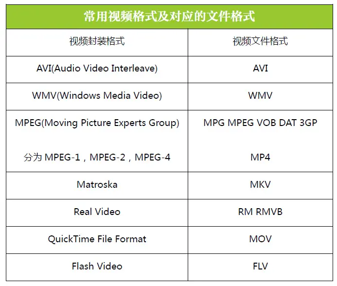 - 1、视频格式:我们经常看到的视频格式mp4、avi、mkv。在技术概念中,叫『视频封装格式』,简称视频格式,里面包含了封装视频文件所需要的视频信息、音频信息和相关的配置信息(比如:视频和音频的关联信息、如何解码等等)。