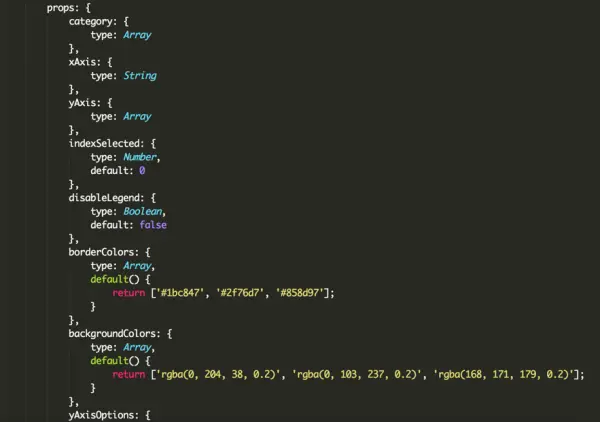 这里需要说明一点的就是对于所有highchars组件的适用度。大家通过看我写的模拟数据也可以看出来,这里我是把一些通用的属性给直接忽略了。如果实际项目的开发中需要的话,大家可以把通用的一些属性的数据直接写到chart.vue文件中。通过props验证,写好default默认值作为通用属性。直接给大家看下我实际开发当中对于一些通用属性的处理吧