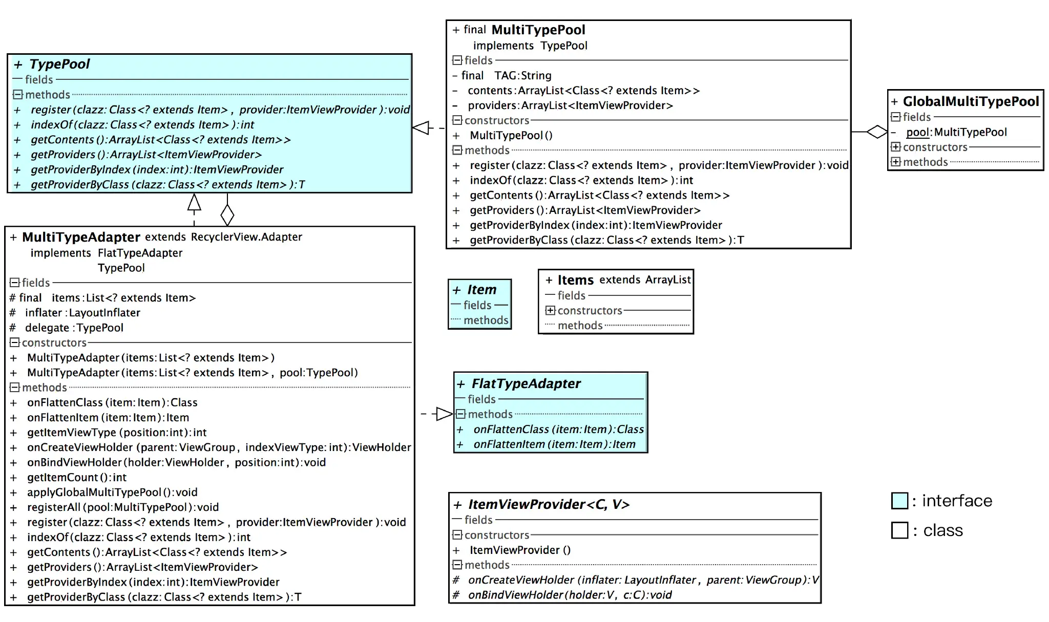 MultiTypeAdapter或ItemViewProvider,甚至你可以重新实现一个TypePool再设置给MultiTypeAdapter. 我们不应该直接到底层去修改、破坏它们。总之,利用开放接口或继承的做法不管对于 MultiType 还是其它开源库,都应该是定制的首选。Q: 在