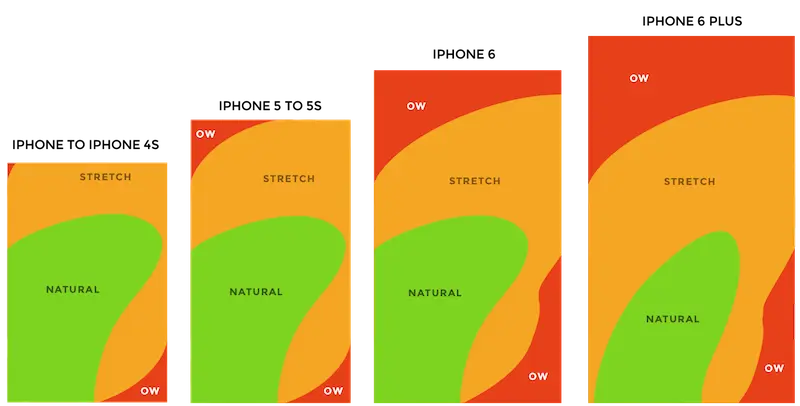 85% of observed users working with their phones using one hand. The following heat map shows sorts of the thumb zones applied to every iPhone display size since 2007. You can see that the bigger the display is, the less easily-accessible zone is.