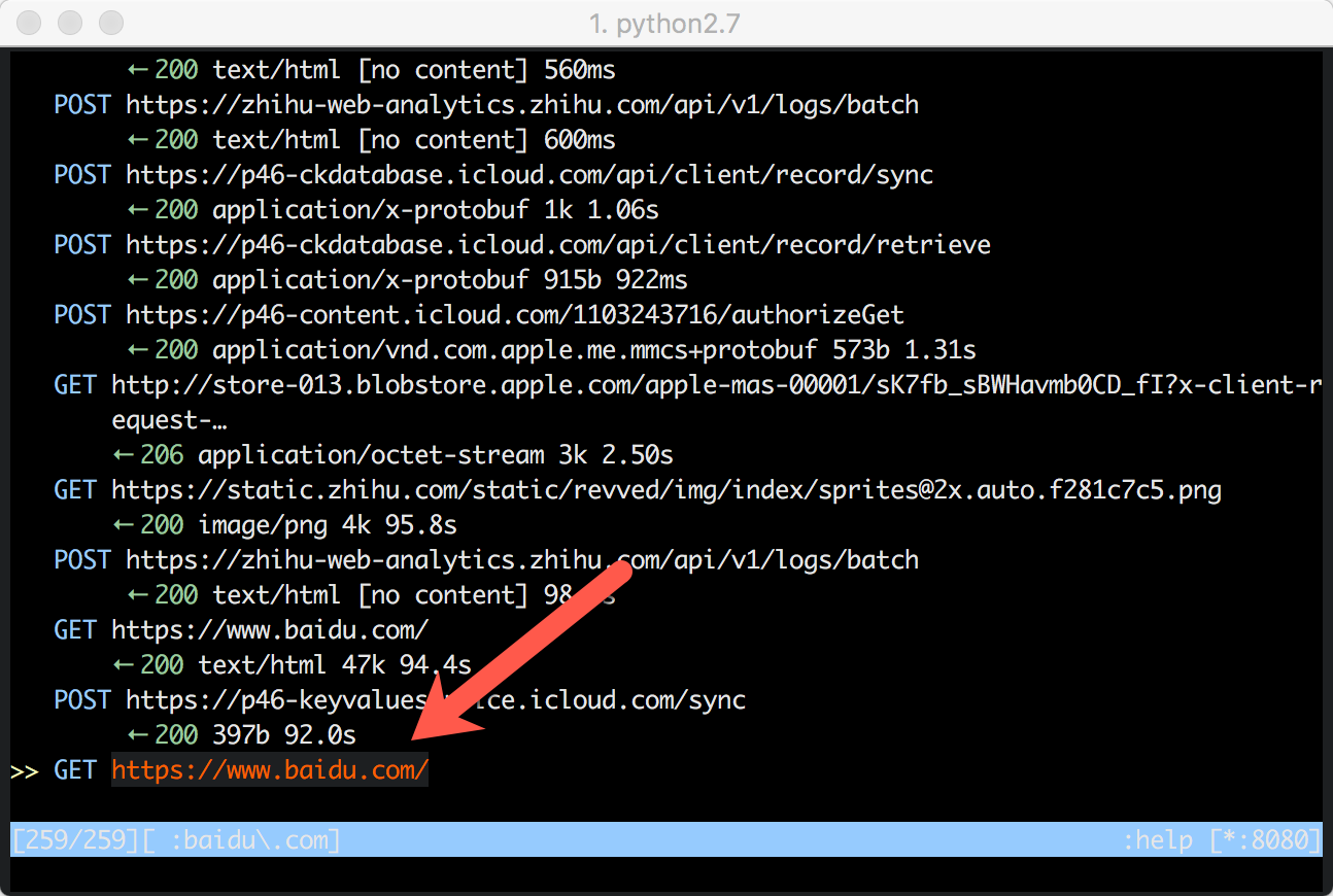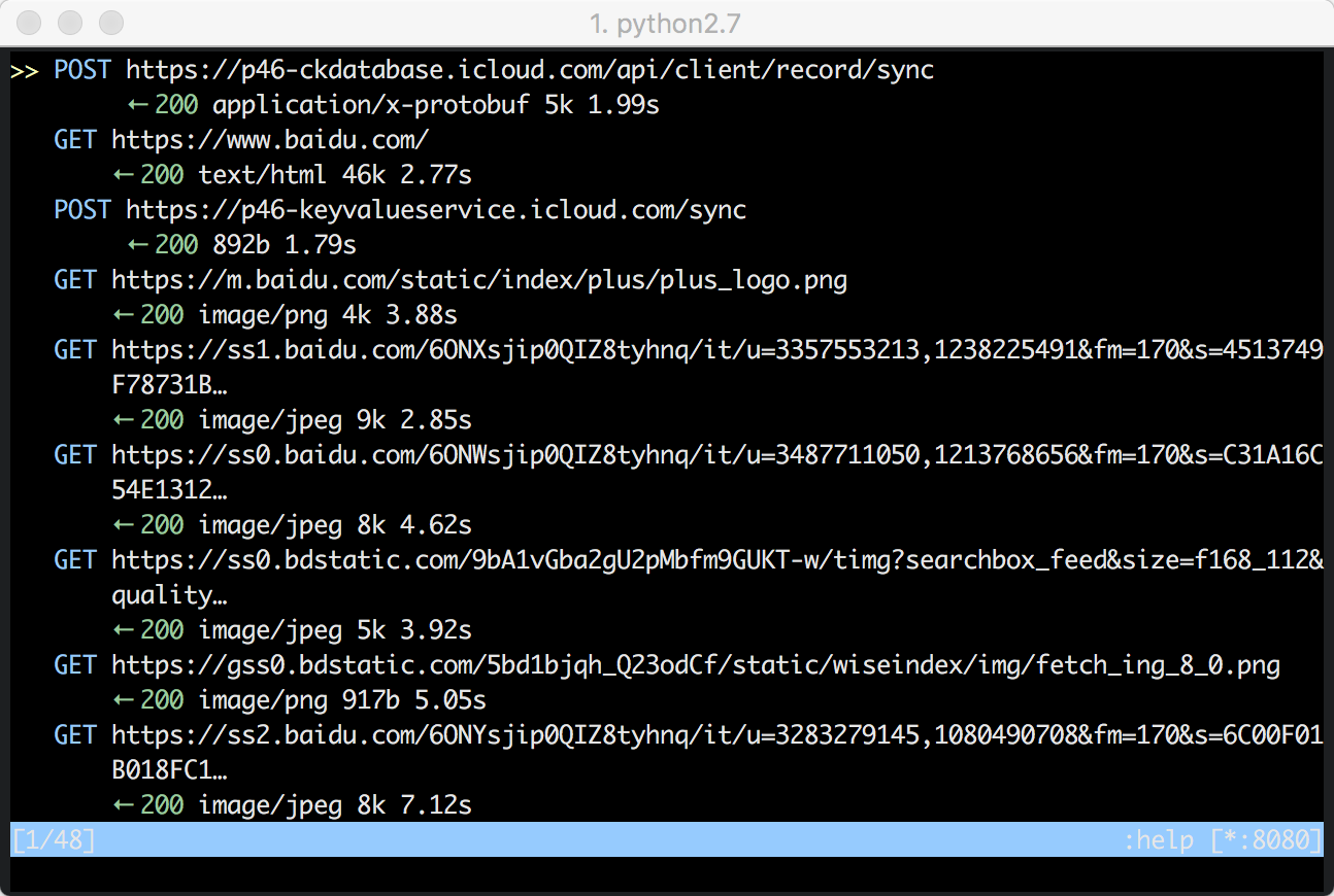 接下来我们就可以使用mitmproxy查看所有通过iPhone端的http请求了,包括https请求,如何破解https流量的后面也会分析。