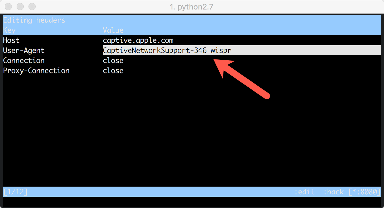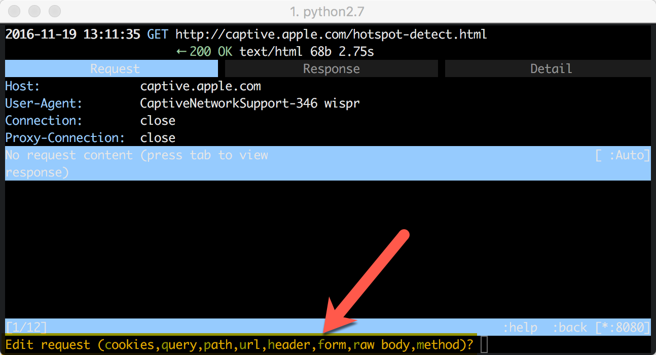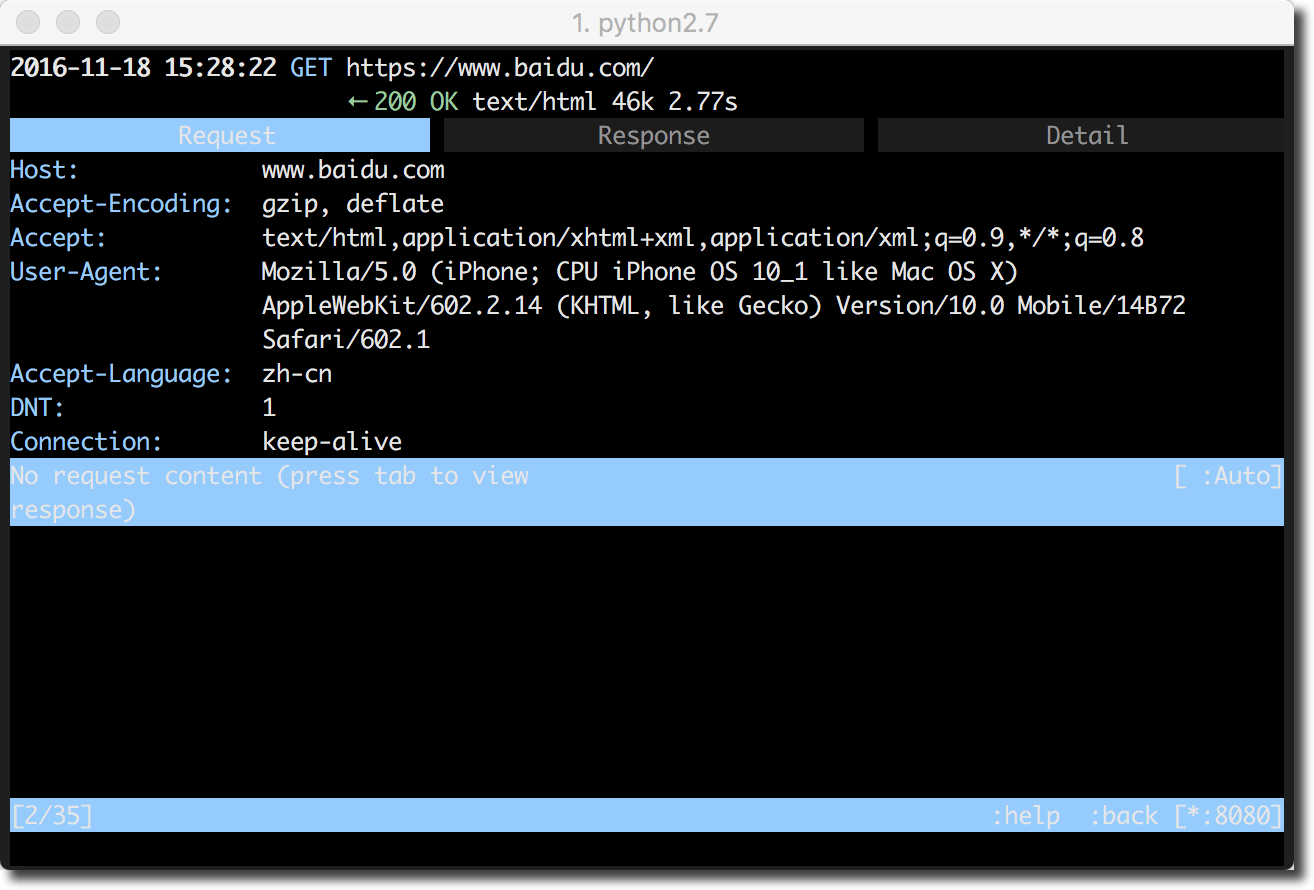 大部分时候我们都是在这两个界面之间切换,切换方式也非常简单。可以在列表界面,用鼠标点击某个请求进入详情界面,但mitmproxy美妙之处在于可以用快捷键来完成界面的切换和功能的使用,而且快捷键与vim保持一致。
