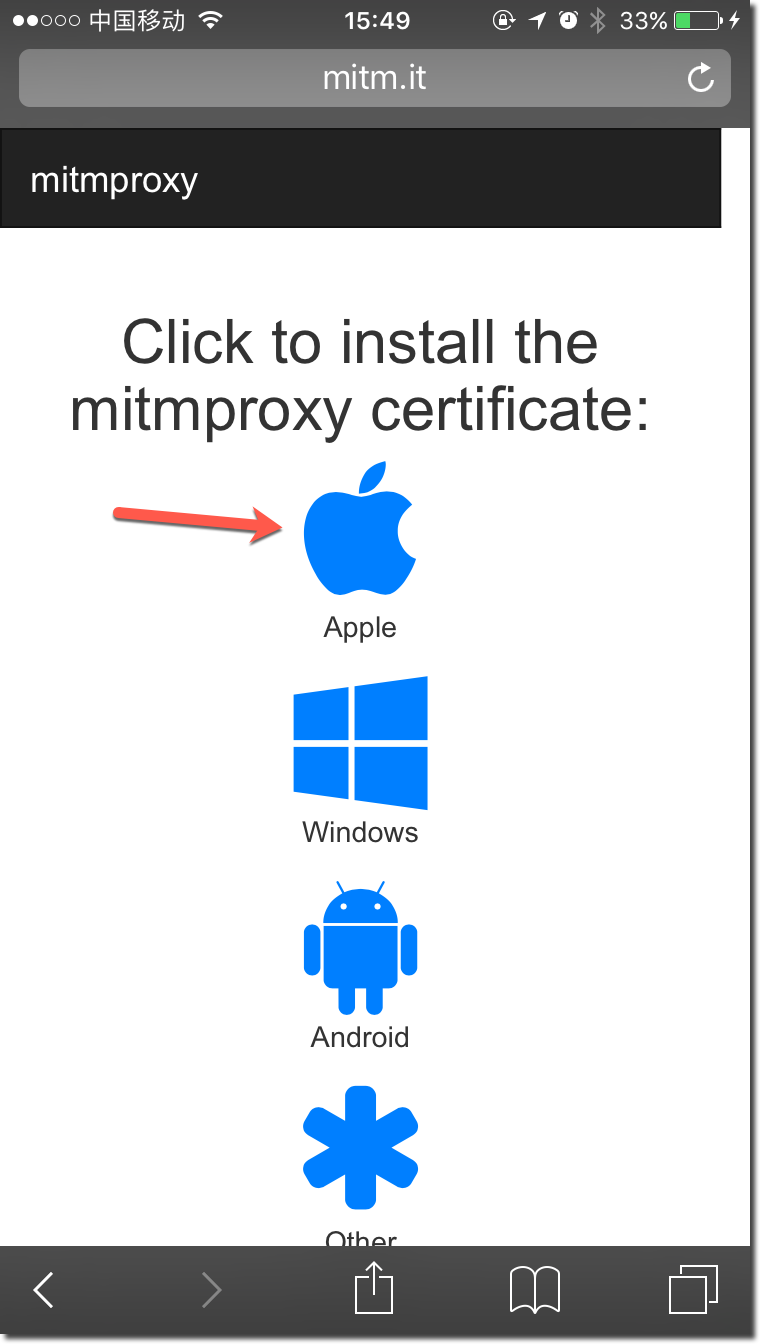 第三步,第一次使用mitmproxy的时候需要在iPhone上安装CA证书,这一步和Charles一样都需要做,原因后面解释。打开iPhone Safari,输入地址:mitm.it,在下图中点击Apple安装证书。