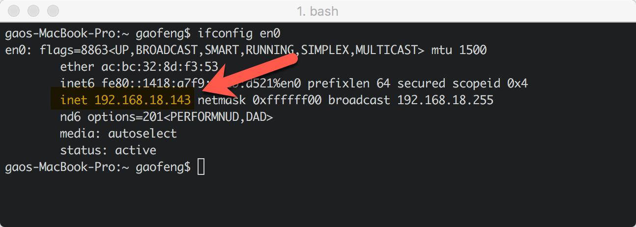 可以通过在terminal输入ifconfig en0获取Mac的IP地址: