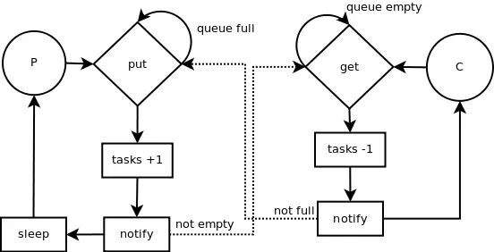 下面我们将上面的生产者/消费者的例子转换成使用队列。源代码可以在threads/queue.py中找到。