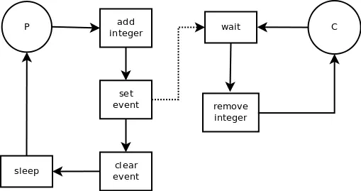 同样我们传入一个Event实例给消费者的构造器,消费者阻塞在wait()方法,等待事件被触发,即有可供消费的整数。