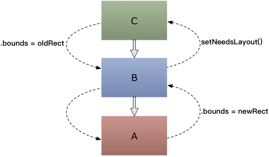 最底下的subview A在layout时更新superview B的bounds,B因为不在layout状态,所以会使superview B调用其superview C的setNeedsLayout()方法,然后进入layout状态,此时C重置B的bounds,B又使A再次layout。因为对B的bounds设置不一致,导致循环下去。