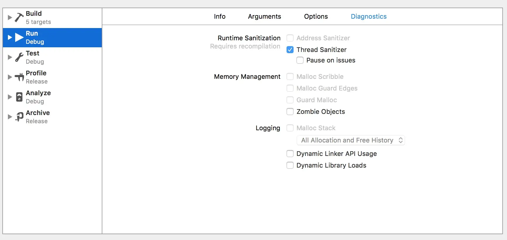 继Address Sanitizer之后,Xcode8中加入Thread Sanitizer用于检查一些线程问题,并会显示在runtime issue列表中,使用Thread Sanitizer需如下图所示开启,重新编译运行后即可。