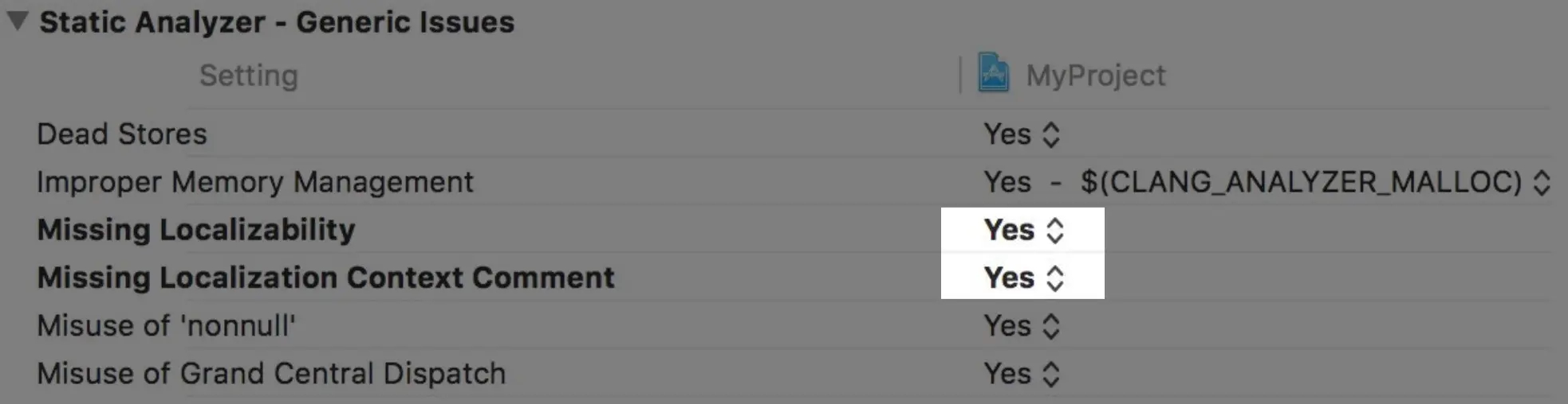 首先需要如下方式开启,Static Analysis将会检查UI元素的文字设置是否使用了NSLocalizedString。