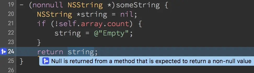 这项检查是针对设置nonnull的property或返回值。当设置为nonnull,但返回值可能为nil时则会有相应warning。
