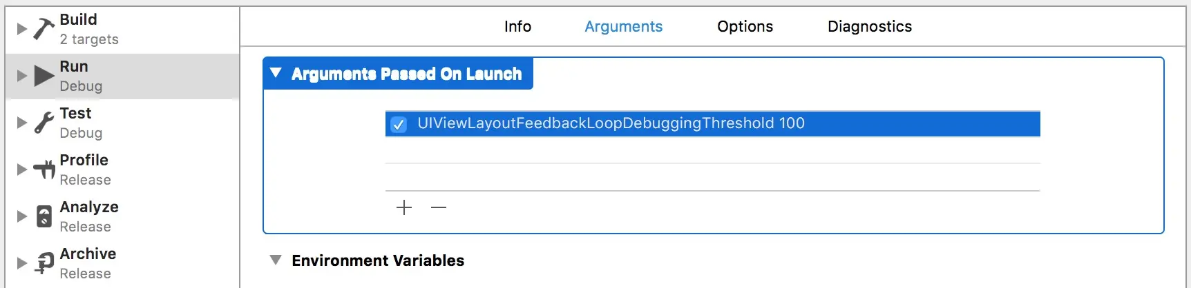 可在Launch Arguments中添加UIViewLayoutFeedbackLoopDebuggingThreshold,设置循环布局阀值,如100,然后当循环布局次数超过阀值时会抛出异常,此时通过po [_UIViewLayoutFeedbackLoopDebugger layoutFeedbackLoopDebugger]可输出详细信息。