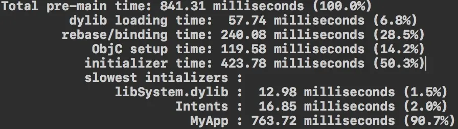 在WWDC2016Session 406 Optimizing App Startup Time中,详细介绍了App启动,即进入main()函数前做了什么事儿,以及如何优化各个过程,另外提供了DYLD_PRINT_STATISTICS环境变量方便测试各个过程耗时。