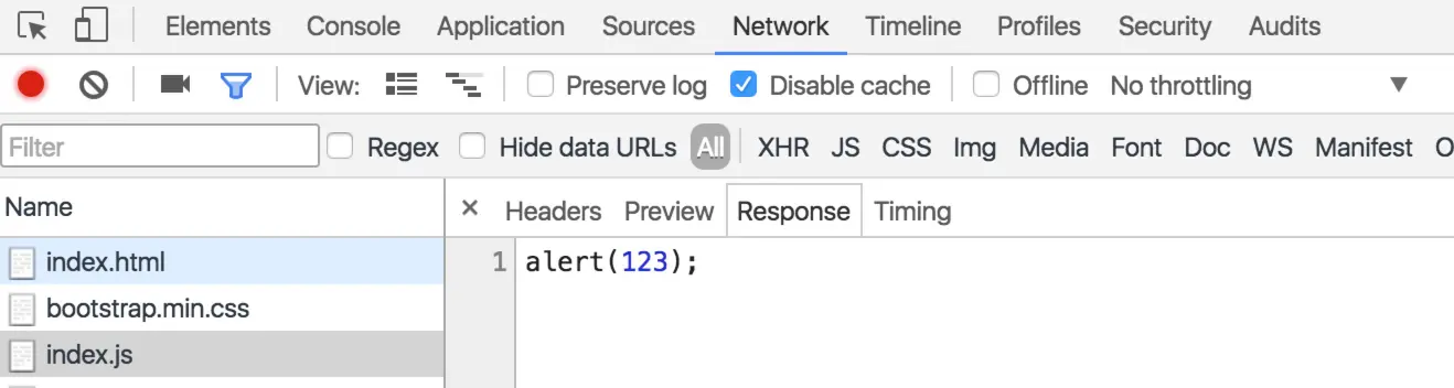 当加载页面index.html后,出123内容的弹窗。通过查看index.js的响应体,会发现响应内容就是alert(123)。