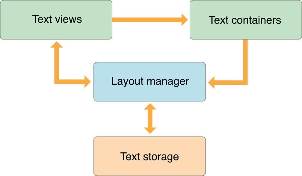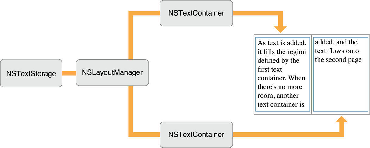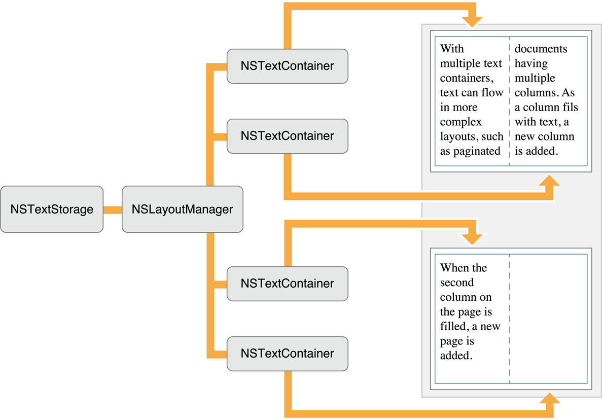 NSLayoutManager 将 Unicode 字符转换成 glyphs(字形),并在 NSTextContainer 定义的范围内布局这些字形。