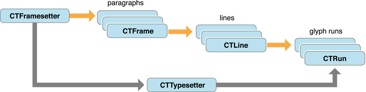 CTFramesetter生成CTFrame,每一个CTFrame代表一个段落。一个CTFrame可以只是一行很长的CTLine或者包含多个CTLine,一个CTLine代表一行文本。