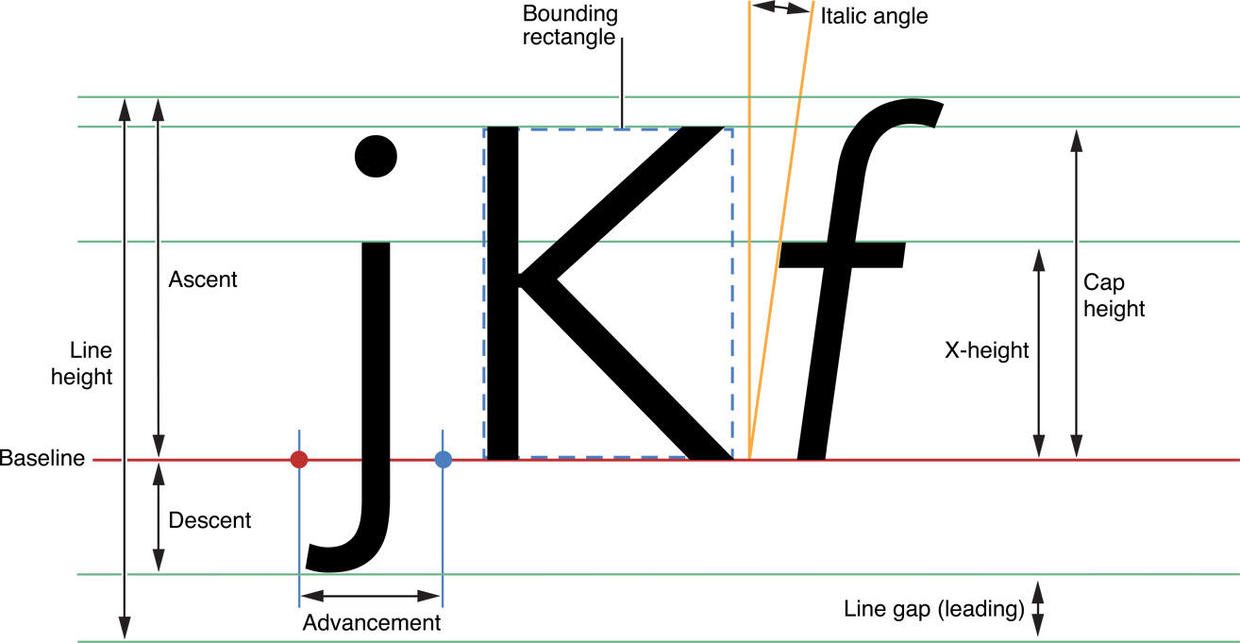 我们可以通过设置不同的字体来改变字符渲染到页面上的样式,UIFont 里有一些度量信息(metrics),如下图所示,