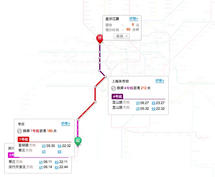 小黄每天要从5号线剑川路出发,到莘庄换1号线,到上海体育馆换4号线,最后在金沙江路下地铁,耗时80分钟,车费6元。